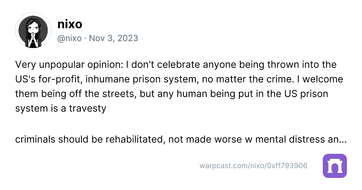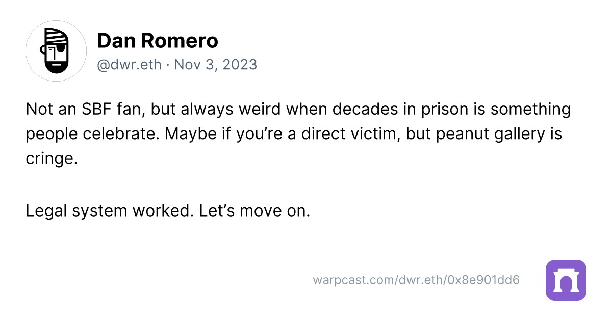 Don't get me wrong, I'm a guilty as anyone in engaging in schadenfreude, but as I've gotten older I've found myself more often reflecting on what it would be like to be in the other person's shoes. Not condoning behavior, but what it would physically feel like to have the fear and uncertainty of looming decades in a prison cell. You sort of lose the appetite to take the cheap shot (or at least your direct at a more irreverent situation). No one is forcing you to tweet / cast the hot take.